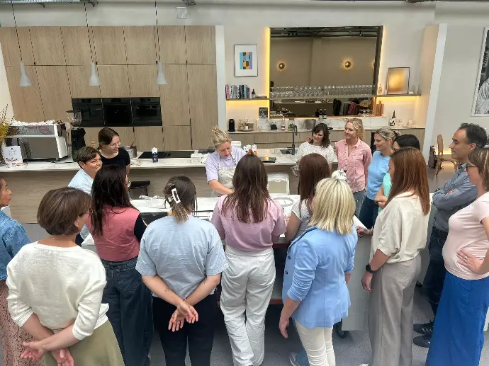 In de nieuwe workshopruimte heeft iedereen zijn eigen kookeiland, we gebruiken de beste toestellen van ATAG zodat je lekker aan de slag kunt. Terwijl je bakt, kun je een kijkje nemen in ons atelier en genieten van de losse sfeer. Het is de locatie om samen iets bijzonders te maken en een gezellige tijd te beleven!